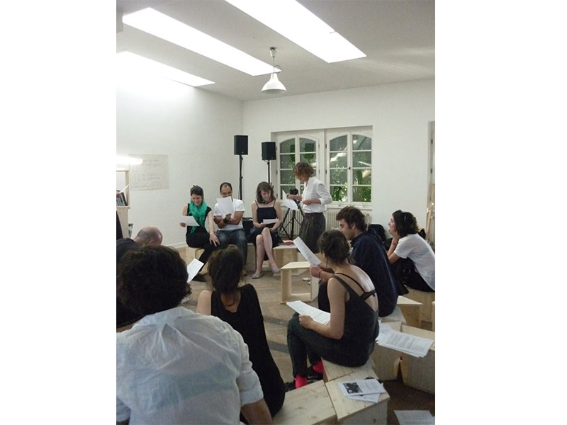 Invited by the curators Judith Lavagna and Lara Merrington to a a symposium on the performativity of curatorial, I was asked to produce a performance which would play the role of a review of the day. Forced to improvised during the symposium, I decide to write a theater play with four characters, a choir and an audience. At the end of the day I present the project to the participants, asking for people to take a role in the play and taking myself the position of director. One had the possibility to remain in the role of being part of the public. I prepared in advance a PLAY button on a computer, which starts the video clip of the song Show must go on by Queen.